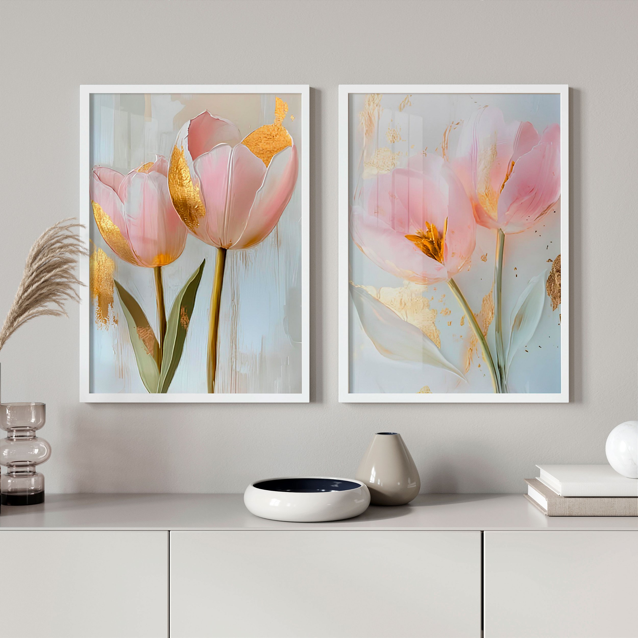 Kit 2 Quadros Com Moldura Arte Tulipas Ouro